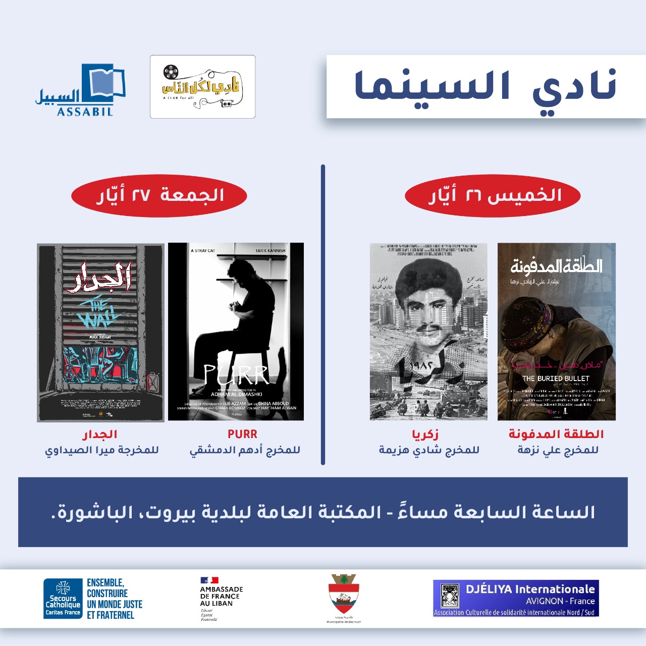 موضوعات ستزخر فيها شاشات ونقاشات "نادي السينما" على مدار يومين، حيث ستتوالى لقاءات مع مخرجين سينمائيين بهدف التعرف على إنتاجاتهم للأفلام الصغيرة، وذلك يومي الخميس والجمعة 26 و27 أيار الساعة السابعة مساءً في المكتبة العامة لبلدية بيروت، الباشورة.