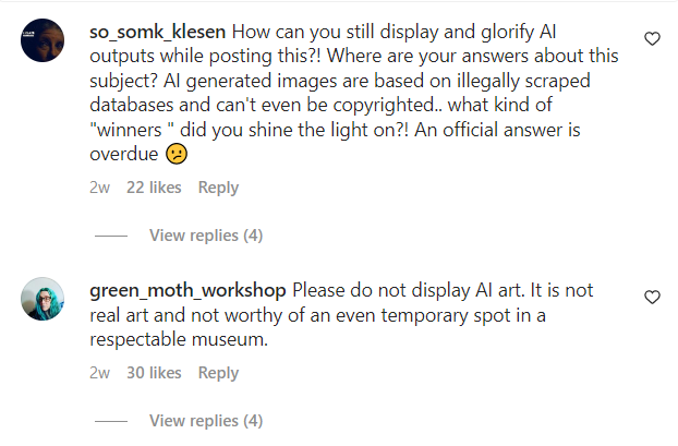 كتب أحد الفنانين على صفحة المعرض على "إنستغرام" إنّ الأمر "وصمة عار وإهانة لا تُصدّق"، وهي وجهة نظر شاركها العشرات من مستخدمي الإنترنت الآخرين. وأبدى المعترضون قناعتهم بأنّ أدوات الذكاء الاصطناعي قد تنتهك حقوق الطبع والنشر لفنانين آخرين، من خلال استخدام أعمالهم كأساس لتوليد الصور بشكل مصطنع.