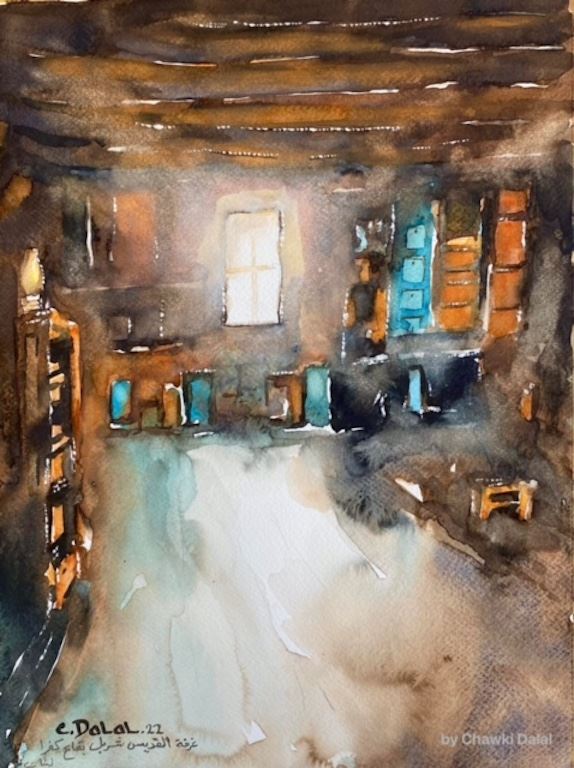 يفيضُ ضوء جليلٌ من نافذة وسطَ الغرفة ووسطَ اللوحة، وكأنّه ذهبُ أيقونةٍ بيزنطيّة أبيضُ. يخترق كلَّ ما في القلّاية، فيُحاوِر قِنْديلاً هنا، وتلتمع منه، ثَمَّةَ، شراراتٌ في كتيّبات قديمة لعلّها مصاحفُ صلواتٍ وتمتماتِ الترابِ مرفوعةً قُدّامَ الخالق كبخور تكادُ تَتَحسّسُ عبقَه في الألوان وفي الدفء الذي توحي به المائيّة.