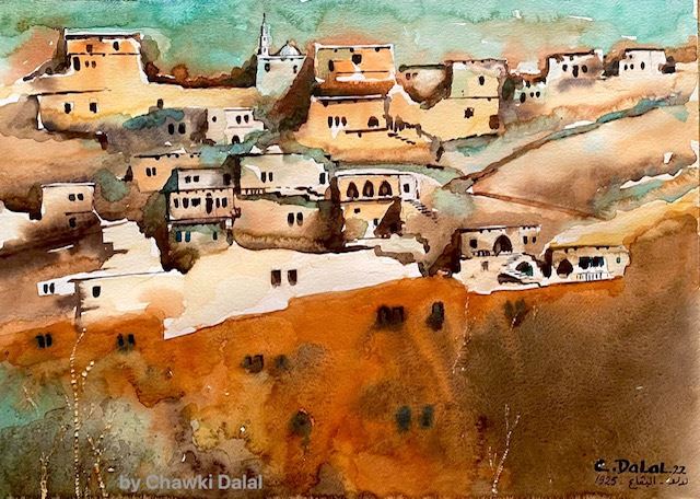 في النصف الأعلى من اللوحة، وزّع الدكتور شوقي الألوان بُقَعًا: بقعًا فاتحة على شبه بياض، تعكسُ إليك أشعة نورٍ كما تفعل حجارة البيوت الصخرية البيضاء المنتشرة في البلدة. وبقعًا تائهة بين برتقالي وتُربِيّ وبُنّيّ، وبعض الظلال وشبه نقاطٍ قاتمة تعبّر عن النوافذ والقناطر.