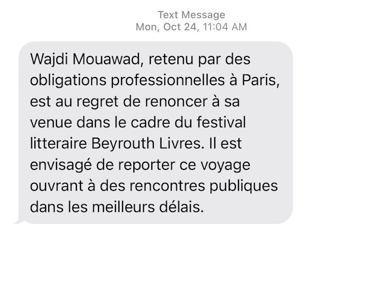 جاء في رسالة الاعتذار التي أرسلتها مكتبة أنطوان: "يتأسّف وجدي معوض عن إعلان عدم حضوره لمهرجان "كتاب بيروت" جراء التزامات مهنيّة في باريس، ومن المقرّر تأجيل اللقاء إلى وقت يحدّد لاحقاً".