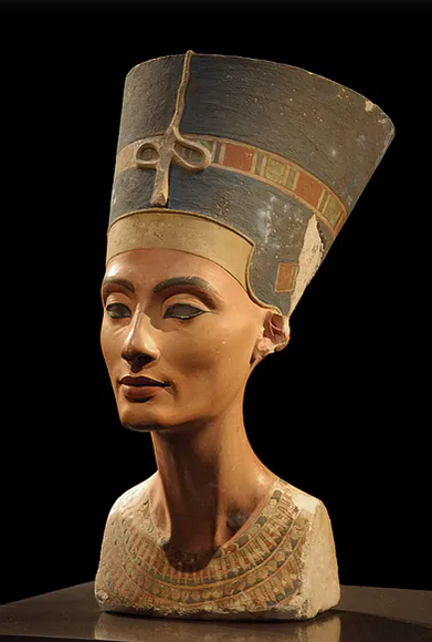 4. نفرتيتي. من السلالة الفرعونية الثامنة عشرة. معنى اسمها "جاءَت الجميلة". هي زوجة الملك أَمَنْحوتب الرابع الذي أَصبح لاحقًا أَخناتون (فرعون السلالة الثامنة عشرة) وستكون لاحقًا حماة توت عنخ أَمون. يروى أَنها من أَقوى النساء في مصر القديمة. حكمَت بين 1370 و1330 (ق.م.) وكانت لها منزلة رفيعة أَثناء حكم زوجها ولم تعش طويلًا بعد وفاته. شُوِّهَت صُورُها بعد وفاتها. وهي اليوم شهيرةٌ بتمثال نصفي لوجهها المنحوت على حجر جيري في واحدة من أَروع القطع الفنية من العصر القديم، موجود حاليًا في متحف برلين الجديد. وهو بين أَندر القطع الفنية الخالدة من مصر القديمة، يُعزى إِلى النحات تحوتموس نحو 1350 ق.م. (النحات الرسمي لدى أَخناتون) وهو وُجد على باب محترفه. من مآثرها وزوجها أَخناتون إِحداث تغيير جذري في الطقوس الدينية الوطنية المتعددة الآلهة، والاتجاه صوب إِله الشمس الواحد "آتِن". يقال إن عهدها بعد عهد زوجها كان الأَغنى في تاريخ مصر القديم. وعلى عهدها انهارت مملكة العمارنة وانتقلَت العاصمة من العمارنة إِلى طيبة (مدينة على طول نهر النيل، نحو 800 كيلومتر جنوبي المتوسط، أَطلالها اليوم ضمن مدينة الأقصر).