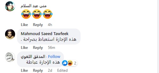 وقال حساب باسم Mahmoud Saeed Tawfeek في تعليقه: "هذه الإجازة استعباط بصراحة"، وهو نفس التعليق تقريبا الذي كتبه حساب باسم المدقق اللغوي إذ قال: "هذه الإجازة عباطة".