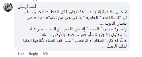 فيما علق حساب باسم أحمد أرسلان قائلا: "لا حول ولا قوة إلا بالله.. هذا تجاوز لكل الخطوط الحمراء.. لم ترد تلك الكلمة "العامية"، والتي هي من الاستخدام العامي بلسان العرب.. ولم يرد معنى "العبط" إلا في اللحم.. أو الميت بغير علة والمقتول بلا جريرة.. أو حفر موضعا بالأرض وشقه.. والله لو كان "العقاد أو الرافعي " على قيد الحياة لأقاموا الدنيا لذلك العبث".