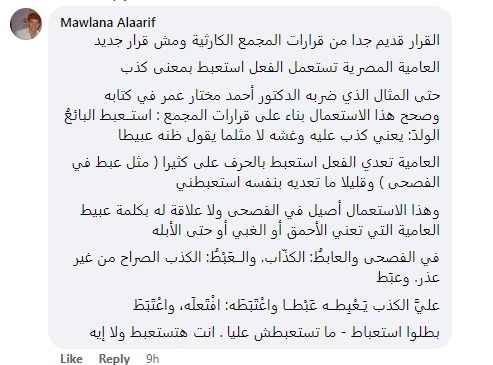 المفارقة أن تعليق حساب باسم Mawlana Alaarif، كشف عن أن القرار قديم، وكتب: "القرار قديم جدا من قرارات المجمع الكارثية ومش قرار جديد.. العامية المصرية تستعمل الفعل استعبط بمعنى كذب".