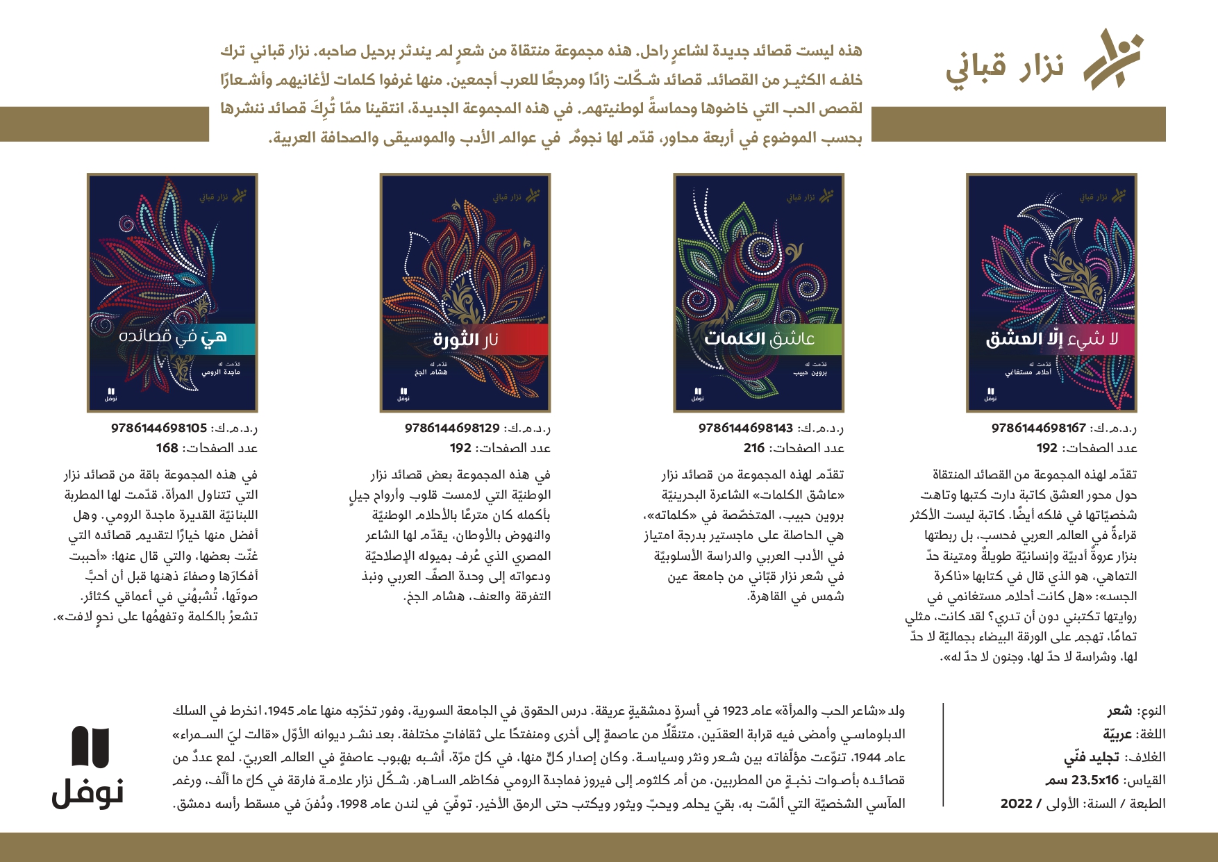 صدرت حديثاً مختارات للشاعر نزار قبّاني في أربعة مجلّدات عن دار "هاشيت أنطوان/نوفل". في كلّ عنوان محور تُبرزه القصائد المنتقاة، ويقدّم له عشّاق نزار من كُتّاب وشعراء من العالم العربي وهم: الكاتبة الجزائرية أحلام مستغانمي، الشاعرة البحرينية بروين حبيب، المطربة اللبنانية ماجدة الرومي، والشاعر المصري هشام الجخّ.