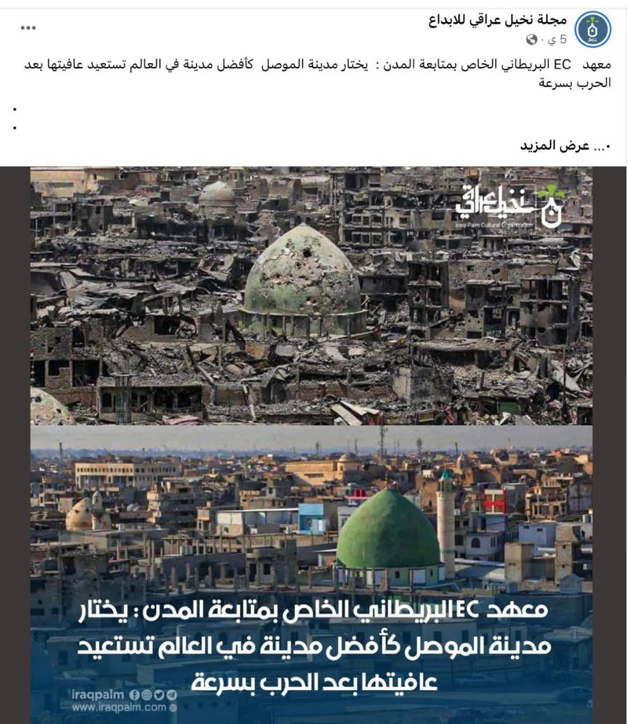الوقائع: منذ أيام، تكثف التشارك في الخبر مع صورتين لمدينة الموصل القديمة، الأولى تظهر حجم الدمار الذي حل بها في حربها ضد تنظيم "داعش"، والثانية تظهر إعادة الإعمار للمدينة بعد تحريرها. وقد نشر الخبر عبر حسابات في وسائل التواصل الاجتماعي، في الفايسبوك (هنا، هنا، هنا، هنا، هنا، هنا، هنا، هنا، هنا) وتويتر (هنا)، مرفقة بالمزاعم الآتية (من دون تدخل أو تصحيح): "معهد EC البريطاني الخاص بمتابعة المدن يختار مدينة الموصل كأفضل مدينة في العالم تستعيد عافيتها بعد الحرب بسرعة".