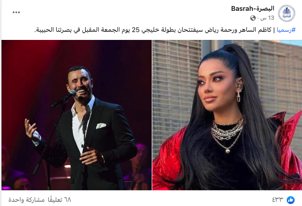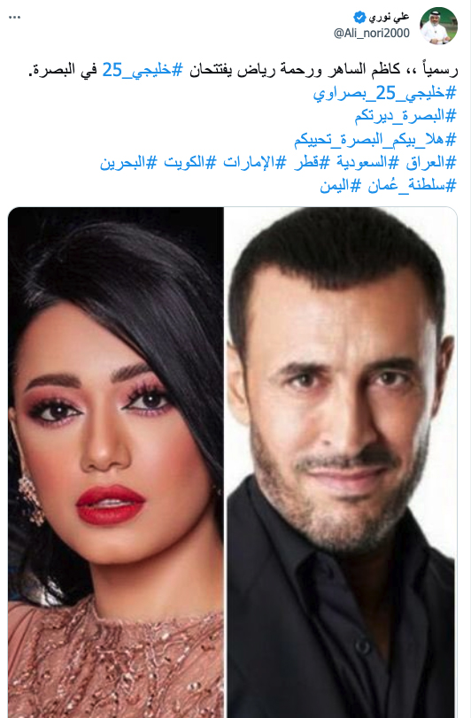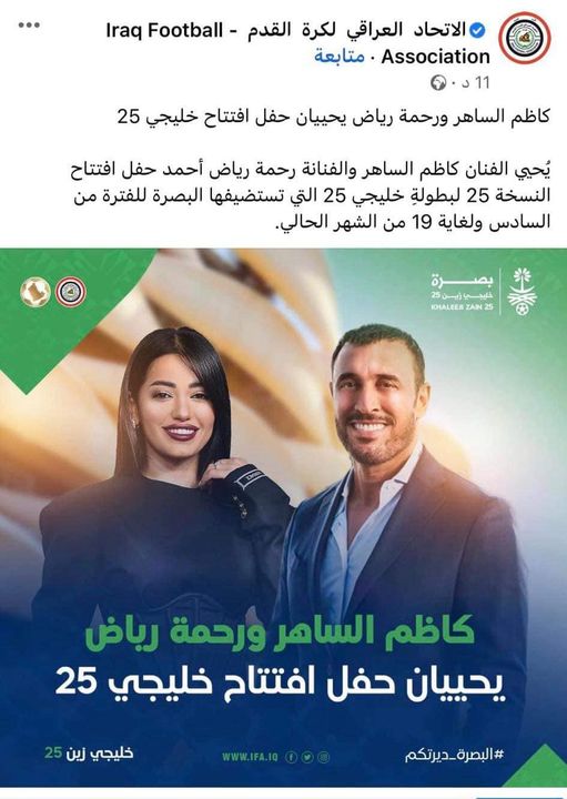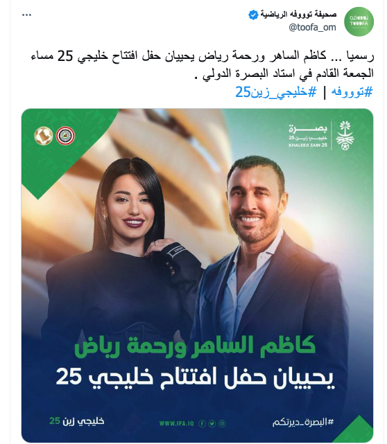 الوقائع: بدأت القصة مع نشر محافظ البصرة أسعد العيداني، الثامنة مساء أمس الأحد، تغريدة عبر حسابه على تويتر جاء فيها: "كاظم الساهر ورحمة رياض سيفتتحان بطولة خليجي 25 يوم الجمعة المقبلة". وبعد ساعة ونصف الساعة، عمد العيداني الى حذف تغريدته، تلاه الاتحاد العراقي لكرة القدم بنشر خبر عبر حسابه على الفايسبوك جاء فيه " كاظم الساهر ورحمة رياض يحييان احتفال افتتاح النسخة 25 لبطولةِ خليجي 25 التي تستضيفها البصرة من 6 الشهر الحالي الى 19 منه".