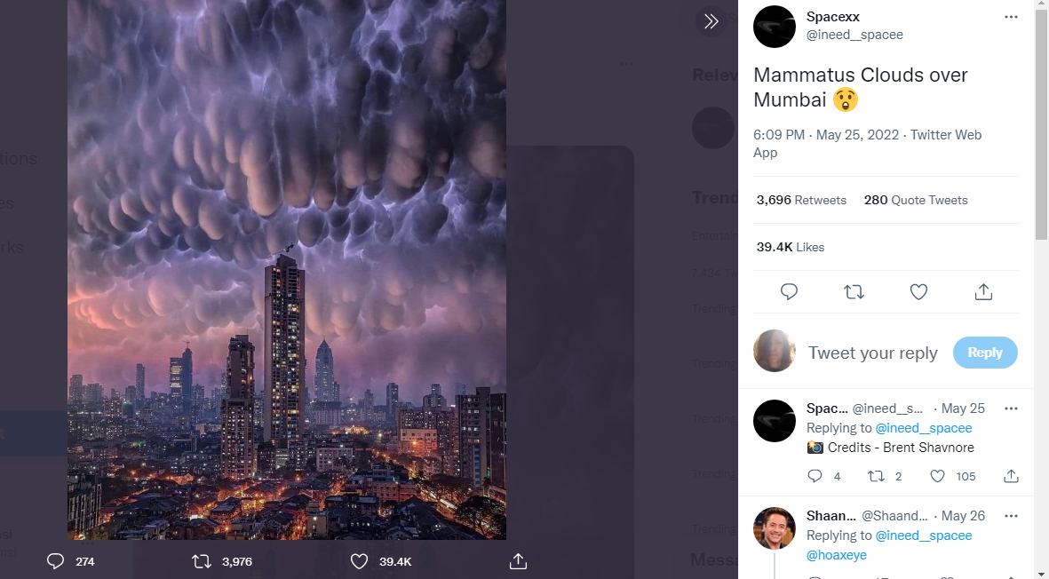 "هذه غيوم الماماتوس فوق مومباي" بالهند. بهذه المزاعم، يتناقل مستخدمون لوسائل التواصل الاجتماع صورة آسرة حصدت عشرات التعليقات التي تعبّر عن الإعجاب والدهشة. غير أنّ هذه المزاعم خاطئة. فالصورة لا تظهر مشهداً حقيقياً، لكونها تلاعباً رقمياً فنياً أنجزه الفنان الرقمي برنت شافنور، ونشره في آب (أغسطس) 2020. FactCheck#