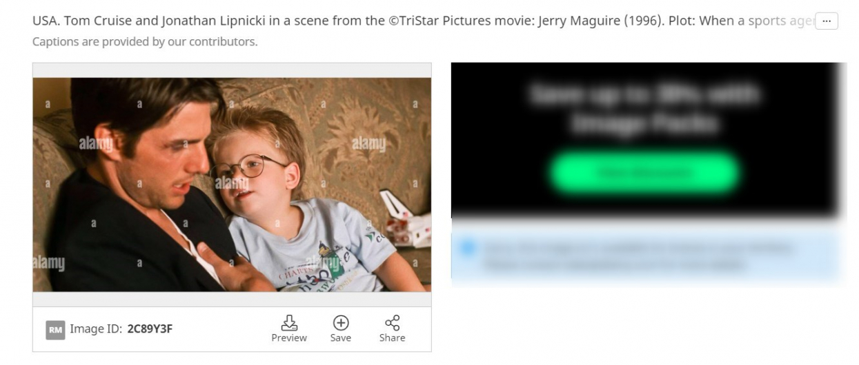 تداول مستخدمون لمواقع التواصل الاجتماعي صورة من جزئين الأولى تظهر توم كروز إلى جانب طفل شاركه التمثيل عام 1996، والثانية ادّعى ناشروها أنّها للطفل نفسه بعد أن كبر وهو برفقة الممثل الأميركي. إلا أنّ الادعاء غير صحيح، والرجل الظاهر في الصورة الثانية هو المخرج كريستوفر ماكويري، لا الطفل الذي مثّل مع توم كروز.