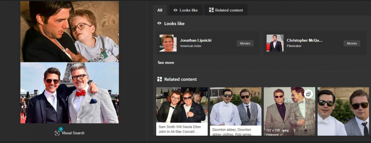 فبمجرّد البحث عن الصورة في "بينغ" يتعرّف محرّك البحث إلى شخصين مختلفين: الممثل جوناثان ليبنيكي عندما كان طفلاً، والمخرج والمنتج كريستوفر ماكويري.