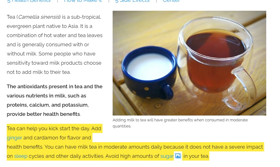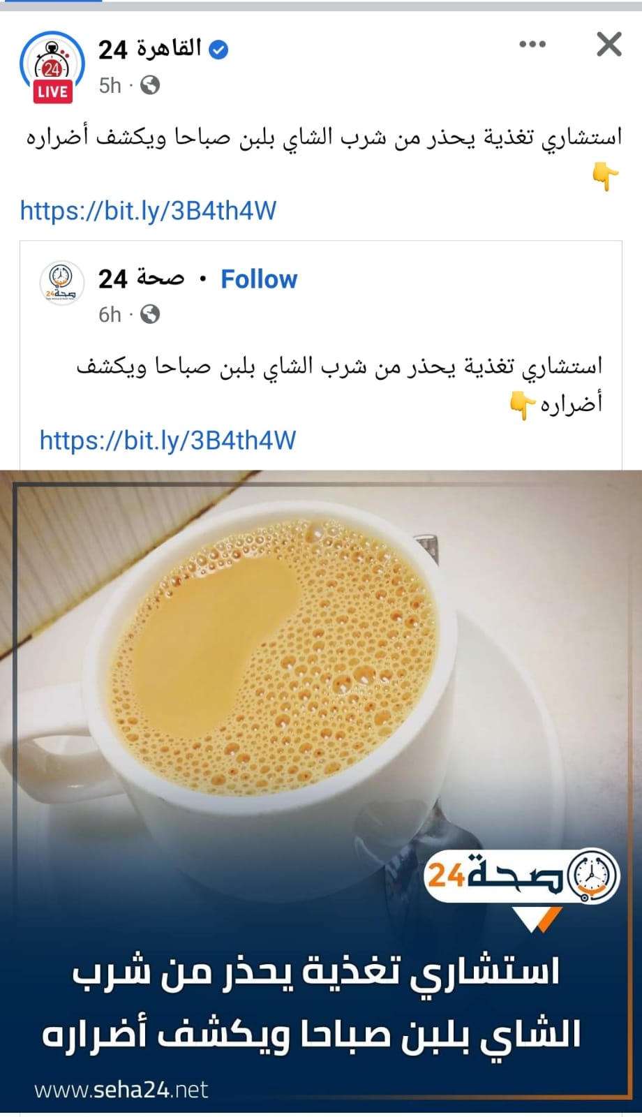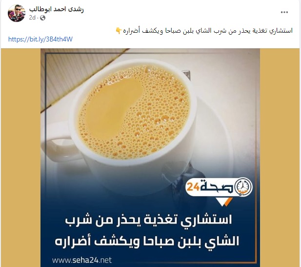 فقد تداول مستخدمون لموقع التواصل الاجتماعي فايسبوك عنوانا لموضوع يقول: "استشاري تغذية يحذر من شرب الشاي بلبن صباحا ويكشف أضراره".