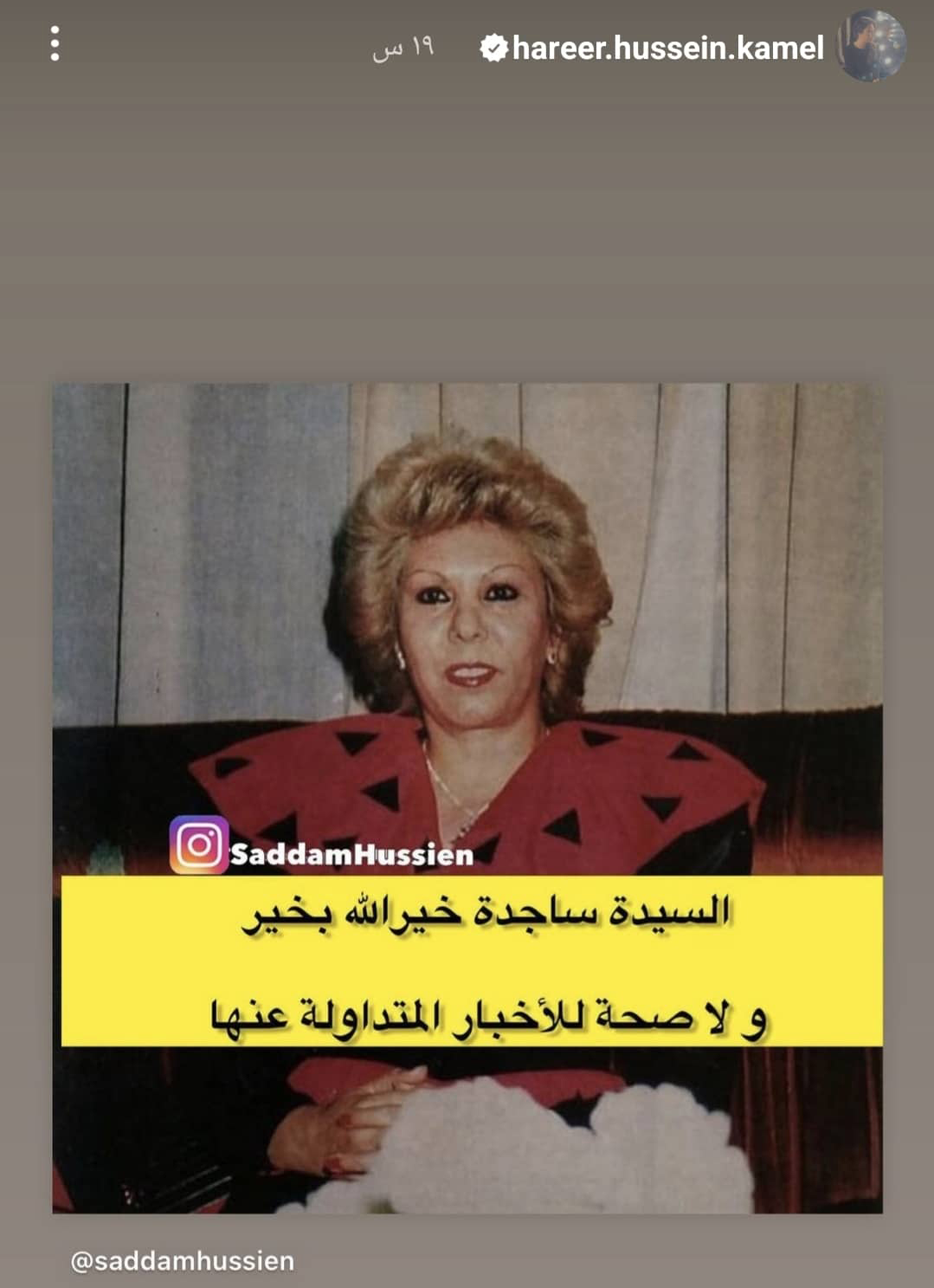 كذلك، نفت حفيدة ساجدة، حرير حسين كامل، الخبر المتداول، عبر نشرها "ستوري" في حسابها على انستغرام (هنا). وكتبت: "السيدة ساجدة خيرالله بخير، ولا صحة للأخبار المتداولة عنها".
