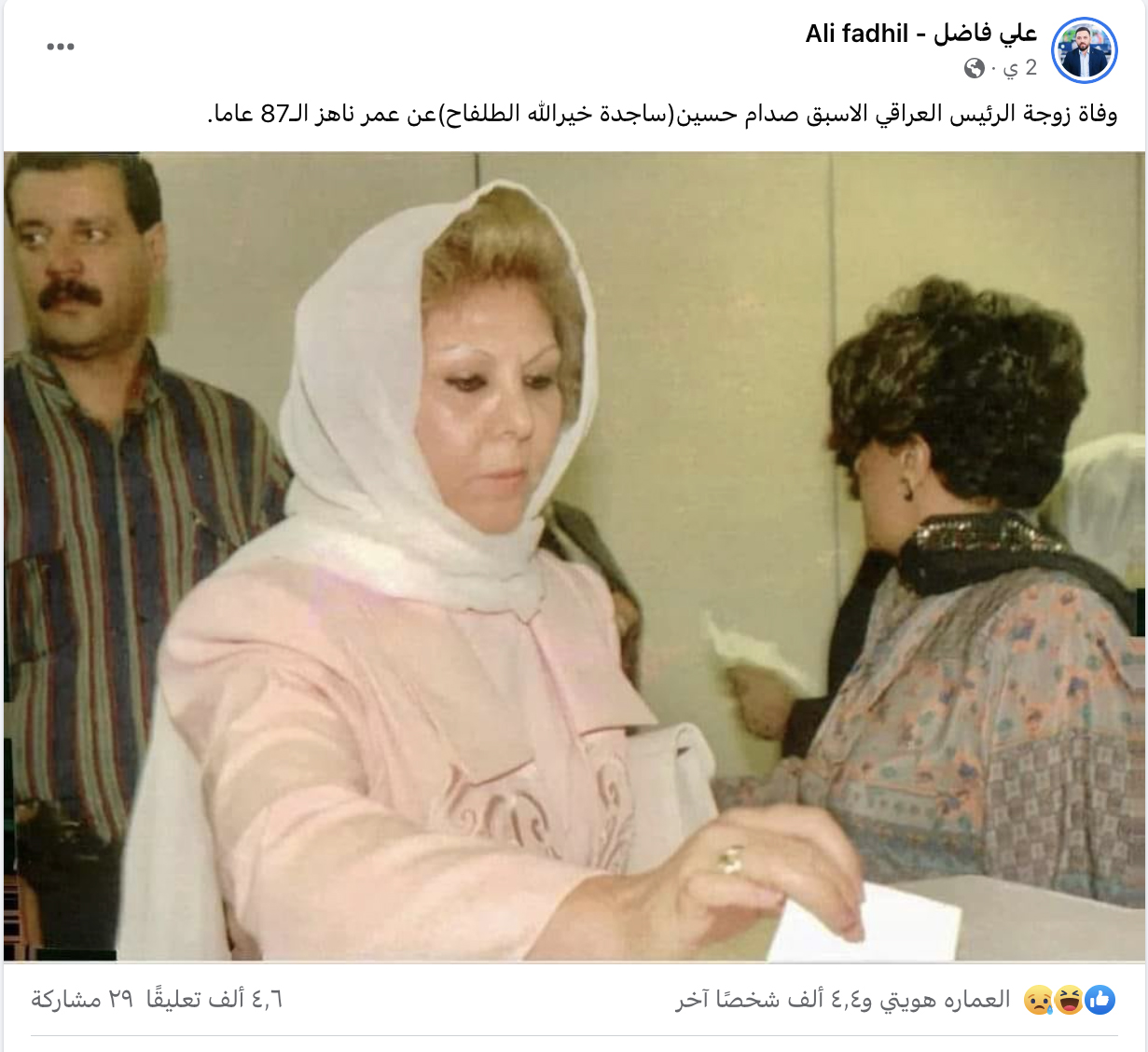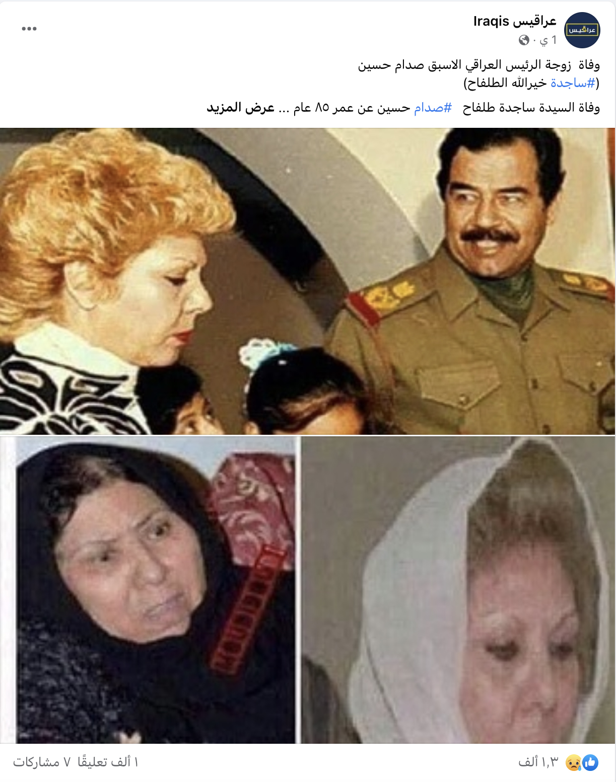 يتناقل مستخدمون لوسائل التواصل الاجتماعي خبراً بمزاعم أن "ساجدة خير الله طلفاح، زوجة الرئيس العراقي الأسبق صدام حسين، توفيت عن عمر يناهز السابعة والثمانين عاماً". غير أنّ هذا الزعم غير صحيح تماما بعد تقصي صحة الخبر. #FactCheck