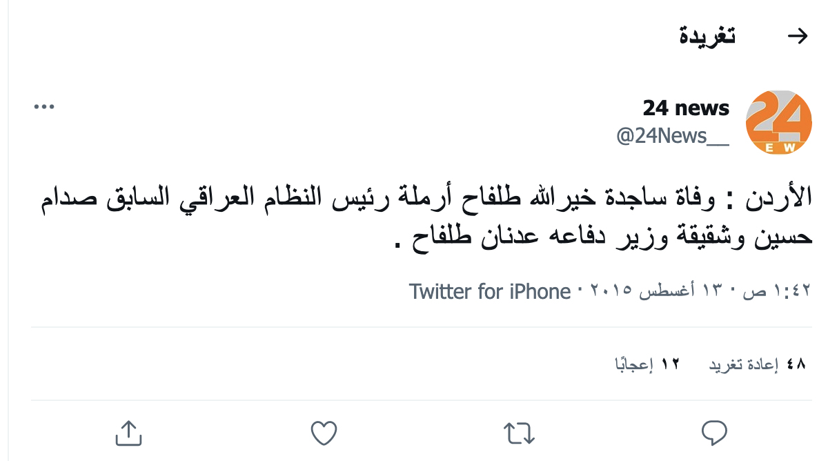 الوقائع: أمس الخميس، تكثف التشارك في الخبر. وقد نشر عبر حسابات عراقية، في الفايسبوك (هنا، هنا، هنا، هنا، هنا، هنا، هنا، هنا، هنا، هنا، هنا) وتويتر (هنا، هنا، هنا، هنا، هنا، هنا، هنا) وجاء فيه (من دون تدخل أو تصحيح): "وفاة زوجة الرئيس العراقي الاسبق صدام حسين ساجدة خيرالله الطلفاح"، وايضاً " نفوق ساجدة خير الله طلفاح هذا اليوم حسب ما تناقلته صفحات اردنية...".
