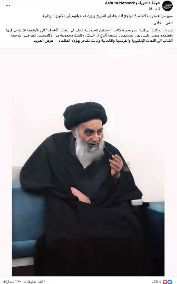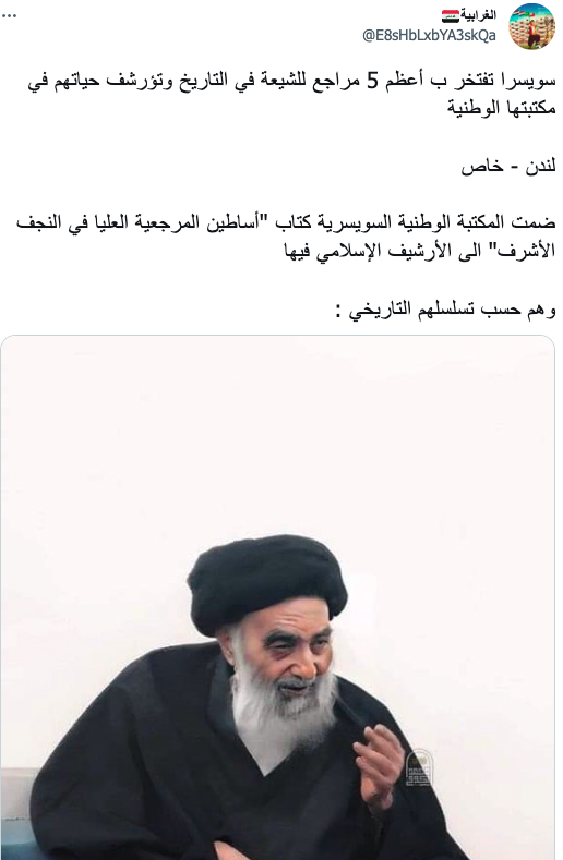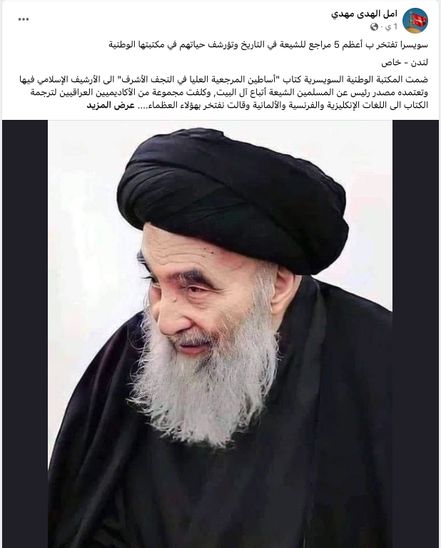 الوقائع: تكثف التشارك في الخبر مؤخراً، عبر صفحات وحسابات في الفايسبوك (هنا، هنا، هنا، هنا، هنا، هنا، هنا، هنا، هنا، هنا) وتويتر (هنا، هنا، هنا، هنا، هنا، هنا). وجاء فيه (من دون تدخل أو تصحيح): "سويسرا تفتخر بأعظم 5 مراجع للشيعة في التاريخ وتؤرشف حياتهم في مكتبتها الوطنية.