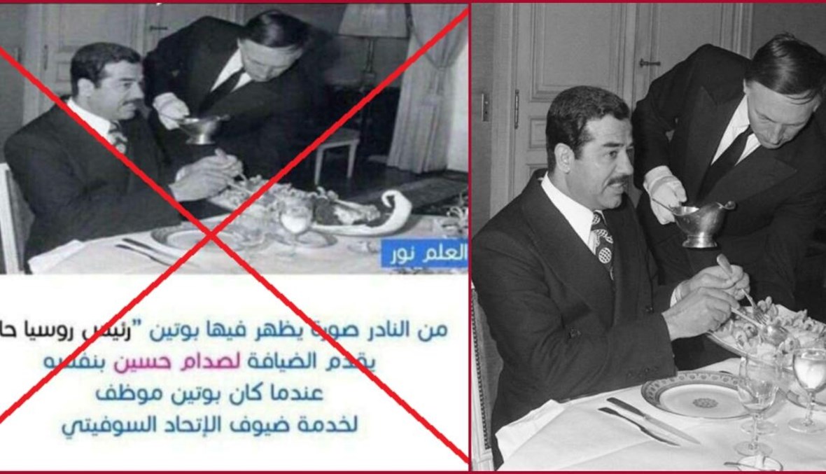 الوقائع: صورة بالابيض والاسود. صدام حسين جلس الى طاولة الطعام ببدلة عادية، والى جانبه رجل حمل آنية. وقد تكثف التشارك فيها أخيرا، عبر حسابات (هنا، هنا...) مرفقة بالمزاعم الآتية (من دون تدخل او تصحيح): "من النادر صورة يظهر فيها بوتين رئيس روسيا حاليا يقدم الضيافة لصدام حسين بنفسه عندما كان بوتين موظف لخدمة ضيوف الاتحاد السوفياتي". وقد سبق ان انتشرت الصورة بالمزاعم عينها في الاعوام الماضية (هنا، هنا، هنا، هنا، هنا...).