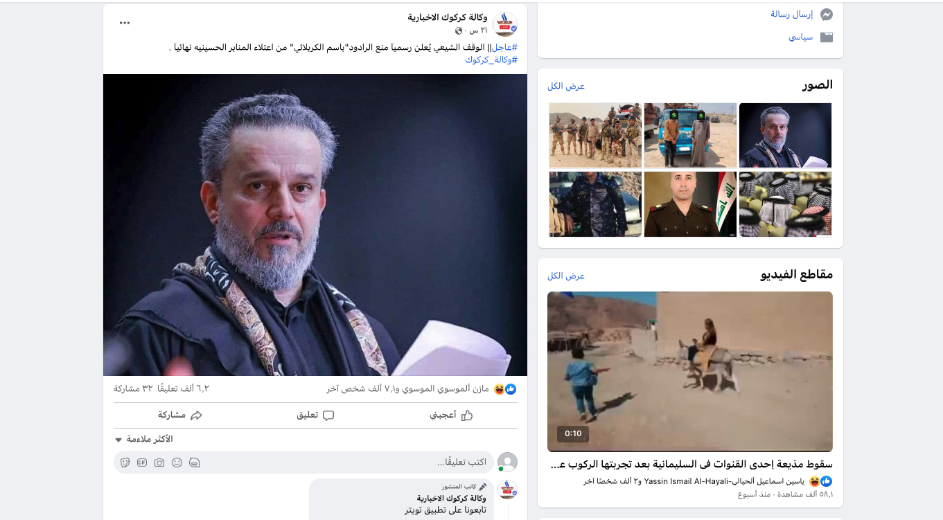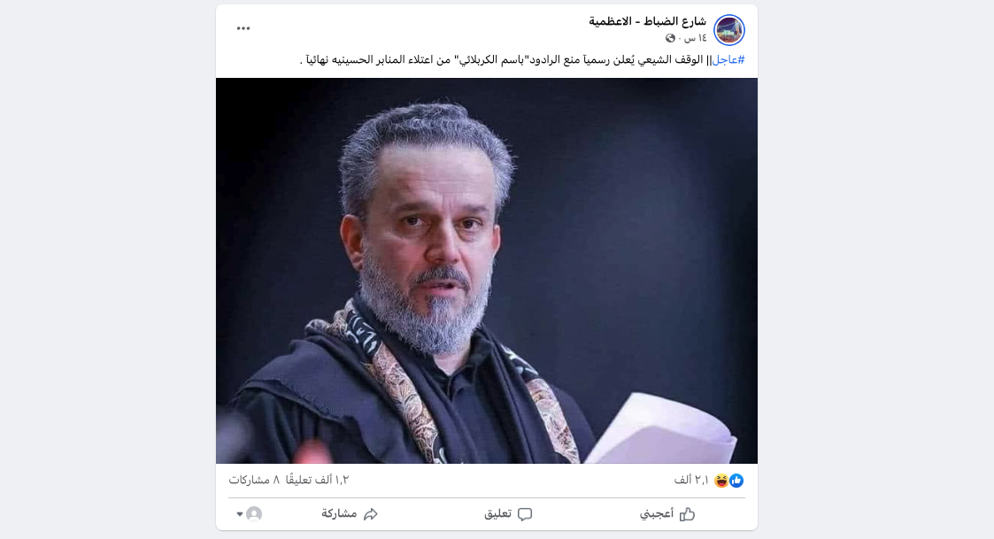 الوقائع: الخبر انتشر في حسابات وصفحات عراقية، أمس السبت، في الفايسبوك (هنا، هنا، هنا، هنا، هنا) وتويتر (هنا)، مرفقة بالمزاعم الآتية: "الوقف الشيعي يُعلن رسمياً منع الرادود الحُسيني باسم الكربلائي من اعتلاء المنابر الحسينية نهائياً".