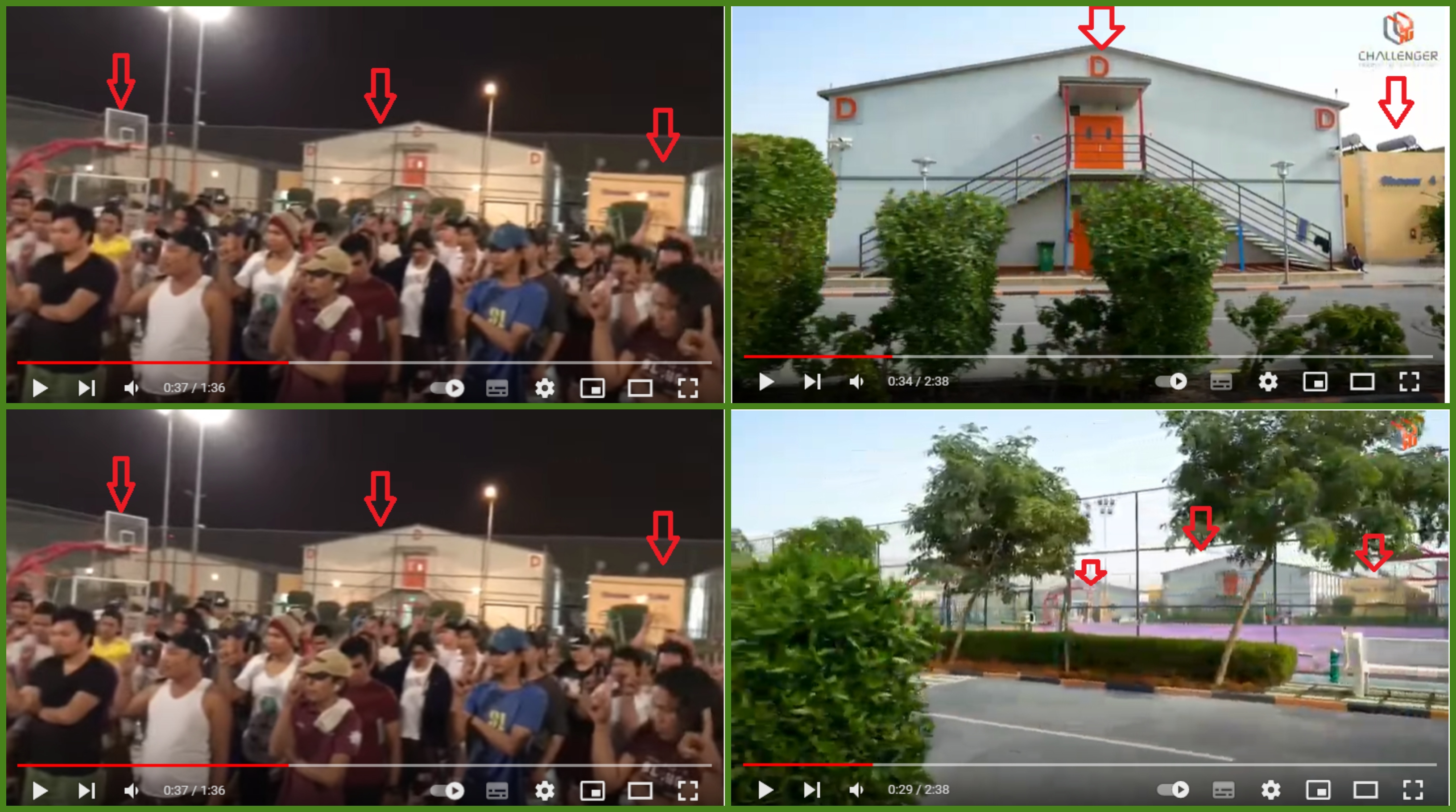واليكم مقارنة بين لقطات من الفيديو المتناقل (ادناه الى اليسار)، ومن فيديوي "مدينة تشالجنر" في الدوحة (الى اليمين).