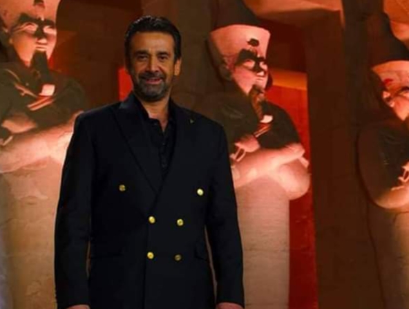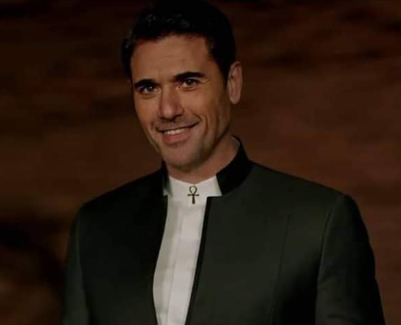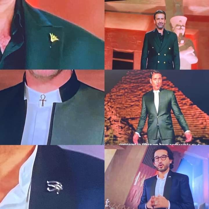 أما أحمد عز، فكان تصميم بدلته مميزاً للغاية، وزينها بدبوس عنق على هيئة مفتاح الحياة.