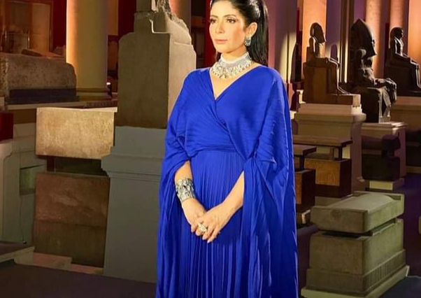 الفنانة منى زكي، نجحت في اختيار إطلالتها التي تماشت مع هذا الحدث التاريخي، حيث ظهرت مرتدية فستاناً أزرق اللون خالياً من التطريز، ولكنها زينته بإكسسوارات فرعونية، جعلتها مثل الملكات.