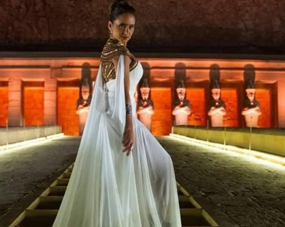 الفنّانة نيللي كريم، التي ظهرت أمام معبد الدير البحري بالأقصر، كانت موفقة لدرجة كبيرة في اختيار إطلالتها، حيث ارتدت فستاناً أبيض، من دون أكمام، مطرزاً من أعلى بتطريز يتماشى مع أزياء النساء في العصر الفرعوني القديم.