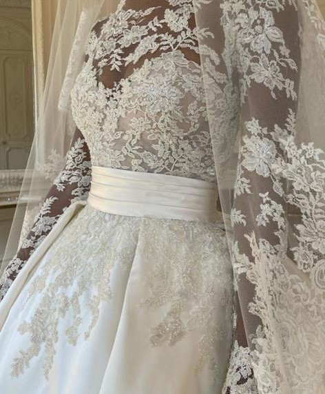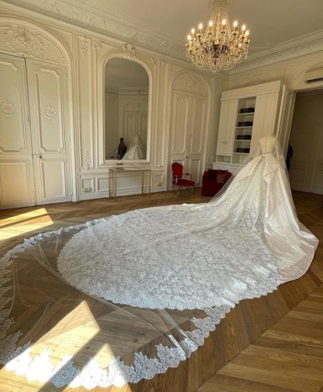 الفستان الراقي والمبهر أشبه بتحفة فنيّة، لدرجة أن توكس قرّرت عرضه في غرفة خاصة كل حياتها، وهو مؤلف من طبقتين: الأولى هي فستان من الدانتيل الفرنسي الفاخر المزخرف بالورود بأكمام طويلة ضيّقة وقبّة عالية، قصّته تعانق الجسم وتتسّع من الأسفل بنمط حورية البحر. والثانية، تنورة مطرّزة يدوياً، بقصّة واسعة ومنفوخة من حرير الدوقة Duchess silk والتول الإيطالي تغلّف الفستان الضيّق. الفستان الأسطوري، مقرونٌ بطرحة طويلة من الدانتيل والتول بطول 15 قدماً.