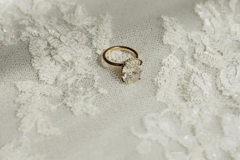 وبما أن الفستان كان الأبرز في إطلالتها، فضّلت جاسمين أن تبقي زينتها بسيطة، واكتفت بتزيين أذنيْها بقرطيْن ماسييْن صغيريْن، ووضعت خاتم الزواج الماسي من مجوهرات ريتاني Ritani، كما انتعلت حذاء من الساتان الأبيض صُمّم خصّيصاً لها من ساره فلينت Sarah Flint.