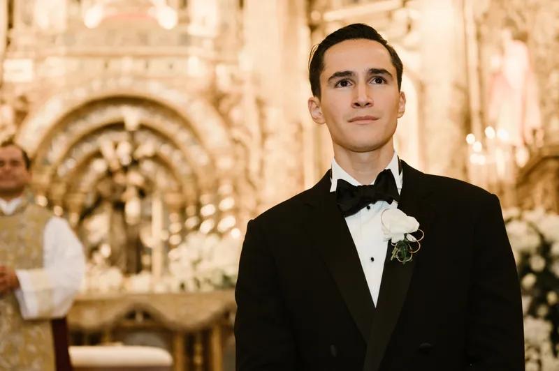العريس أيضاً بدا أنيقاً جداً من خلال بدلة توكسيدو سوداء مؤلفة من سروال بقصّة كلاسيكيّة، وسترة مزدوجة الصدر فوق قميص أبيض، تزيّن ياقته عقدة سوداء من أرماني Armani.