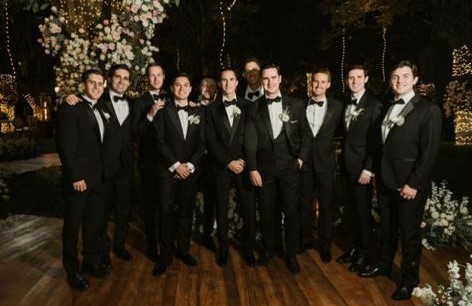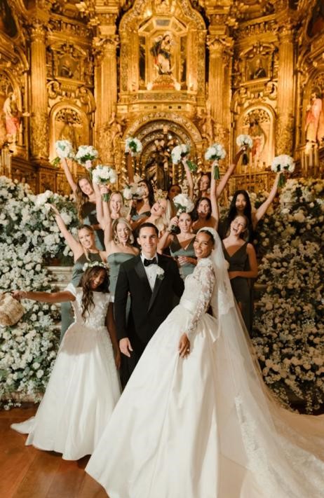 إشبينات العروس تأنقّن أيضاً بفساتين من ساتان الحرير بلون موحّد هو الزيتي وحملن باقات من الورود البيضاء، في حين جاءت إطلالة الشباب المواكبين للعريس مطابقة له، وقاموا بتزيين بدلاتهم بوردة بيضاء كما فعل خوان.