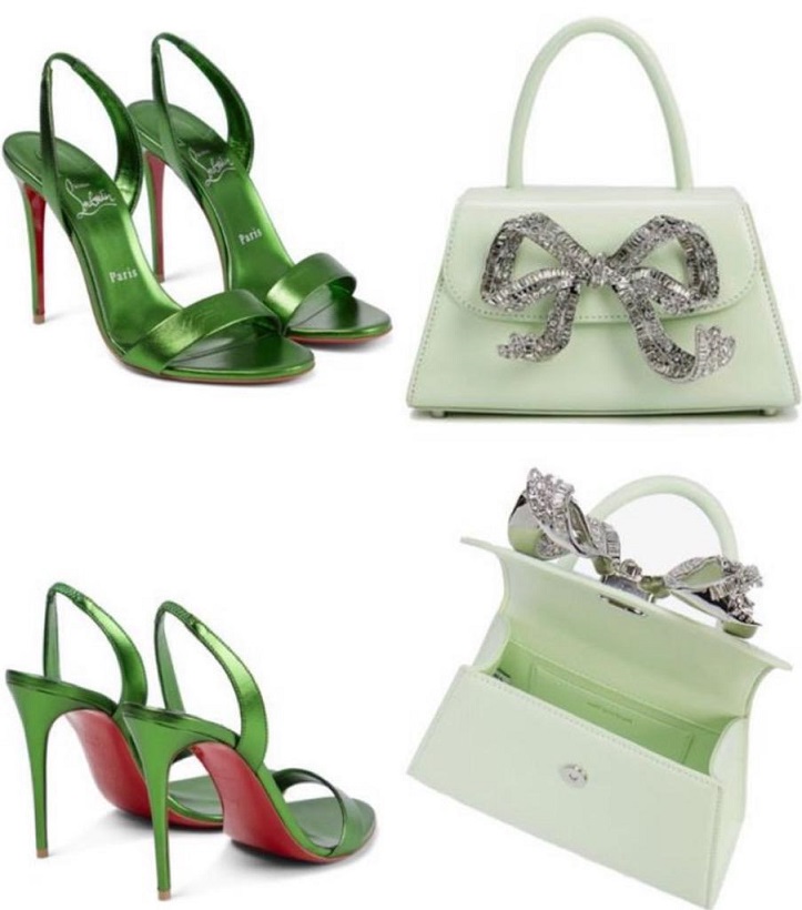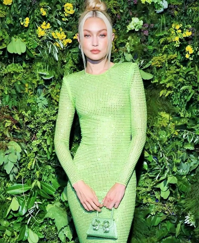 إطلالة جيجي اللافتة جاءت بفستان طويل بحدود الكاحل، مميّز بقصّة ضيّقة تنحت جسمها، وكُمّيْن طويليْن، وهو من نسيجٍ شبه شفّاف مطعّمٍ بالكامل بالترتر البرّاق من علامة Self-Portrait، أقرنته مع حقيبة يد صغيرة تحاكي لون الفستان وبتفصيل عقدة كبيرة على شكل فراشة مرصّعة بأحجار الكريستال البرّاقة The Bow Mini Bag in Pistachio Diamanté ومن العلامة نفسها بقيمة 540$، وانتعلت صندلاً من الجلد اللمّاع أخضر اللون، مفتوحاً بكعبٍ عالٍ رفيع وحزامٍ يعانق الكاحل O Marylin Spinach Laminato Sandals من Christian Louboutin بقيمة 700$.
