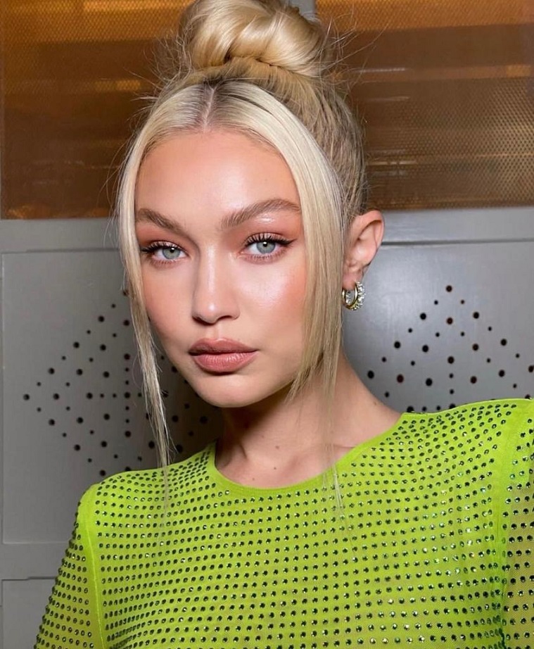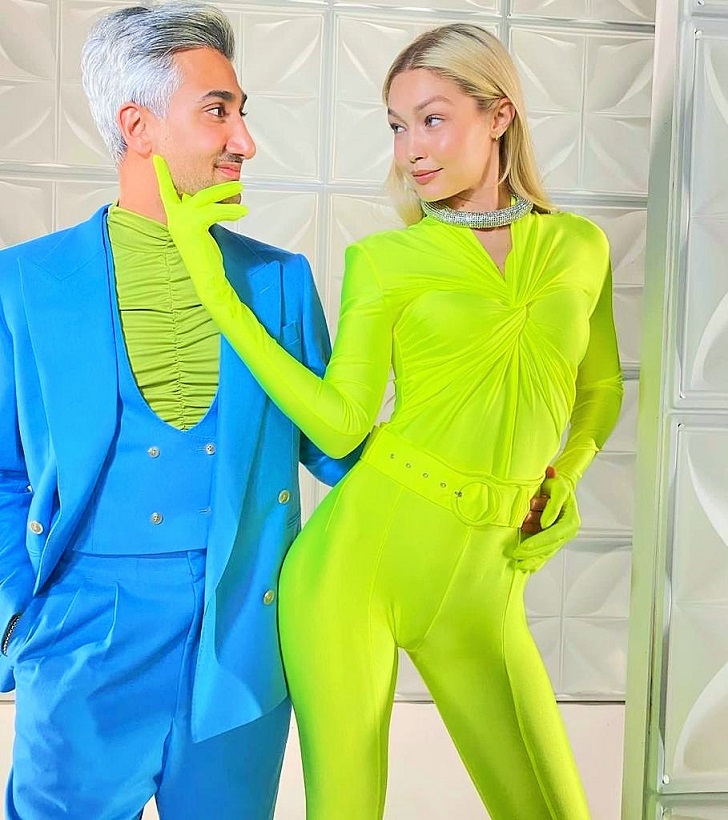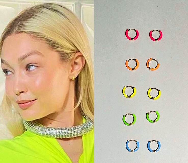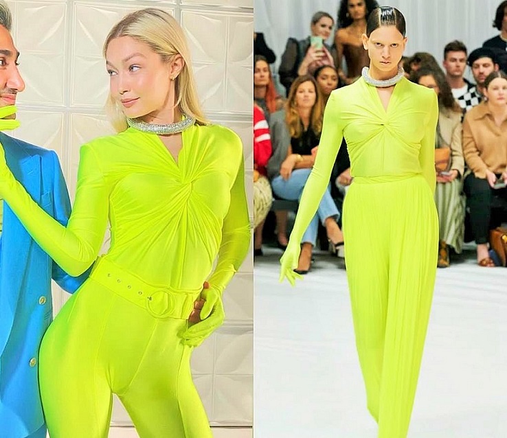 إطلالة جيجي حديد السابقة بلون الفستقي النيوني كانت في مناسبة مختلفة منذ شهرين تقريباً، وقد اختارت حينها "جمبسوت" بكُمّيْن طويليْن وتفصيل مزمومٍ عند الصدر، وحزامٍ يعانق الخصر من علامة Richard Quinn لربيع 2022، أقرنته مع طوقٍ فضي برّاق، وقرطيْ أذنيْن صغيريْن جداً بلون زيّها Neon Enamel Huggies in 14K Gold من Fry Powers بقيمة 150$.