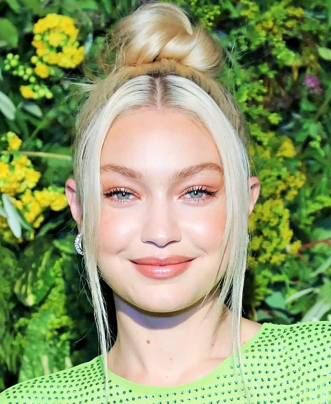 من الناحية الجمالية، بدت جيجي فاتنة بمكياج خفيف ومشرق اعتمد على الألوان البرونزيّة الفاتحة فوق الجفون وخط الرموش السفلية، كما نحتت ملامح وجهها بالدرجات البرونزيّة نفسها، وغلّفت شفتيْها بلون البيج البرونزي. وقد استُعمل الكحل المائي الأسود لتحديد عينيها من خلال رسم خط رفيع جداً عند جذور الرموش العليا ممدودٍ خارج حدود العين بقليل، وصقلت الرموش العليا بالماسكارا السوداء. أما تسريحة شعرها فجاءت بنمط الشينيون المرفوع إلى أعلى مع خصلتيْن قصيرتيْن تنسدلان من جانبي الوجه.