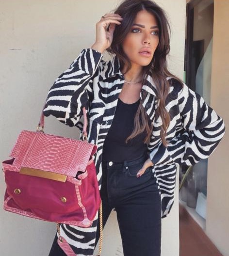 اختارت مصمّمة الأزياء السعودية والمؤثرة في عالم الموضة قميصاً طويلة وواسعة بلونيّ الأبيض والأسود بنمط التخطيط "زيبرا" أي الحمار الوحشي من العلامة التجارية "إيتش أند أم" H&M نسّقتها فوق ملابسها السوداء المؤلفة من توب وبنطلون جينز بقصّة ضيّقة، وأقرنت الإطلالة بحقيبة كتف من جلد التمساح الصناعي باللون الوردي الزاهي من "أماندا نافاي" Amanda Navai.
