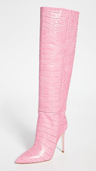 - جزمة وردية بحدود الركبة من جلد التمساح الصناعي من علامة "باريس تكساس" Paris Texas Croc-Effect Leather Knee-High Boots in Pink