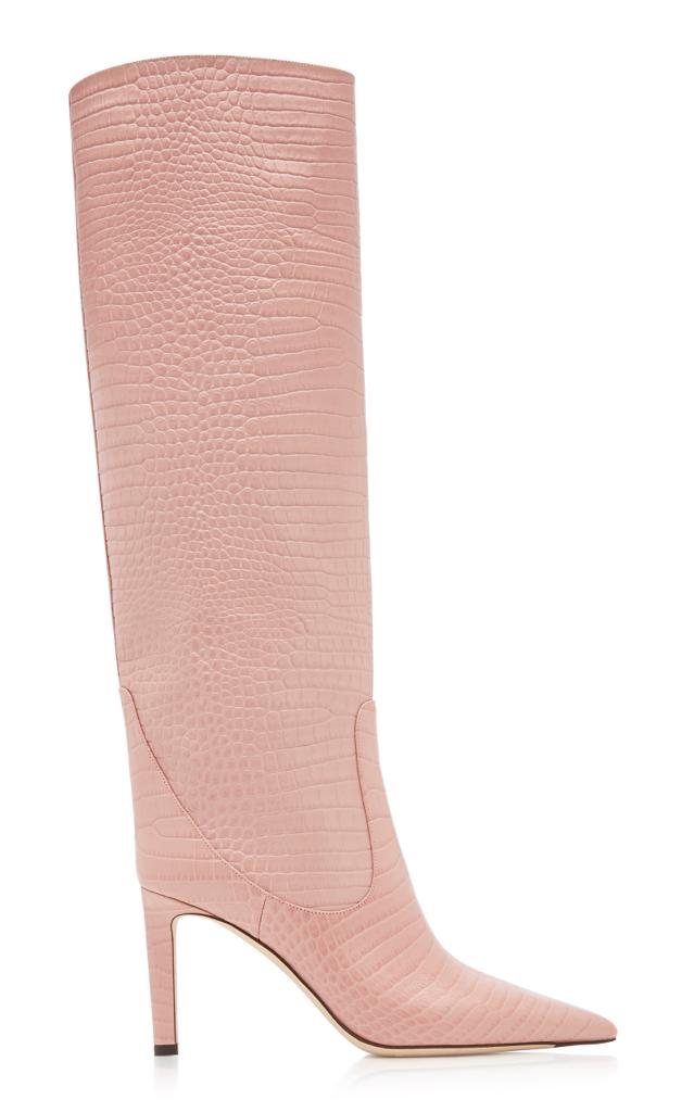 - جزمة مدبّبة بحدود الركبة بنمط جلد التمساح واللون الوردي الزاهي من "جيمي شو" Jimmy Choo Mavis Croc-Effect Leather Boots