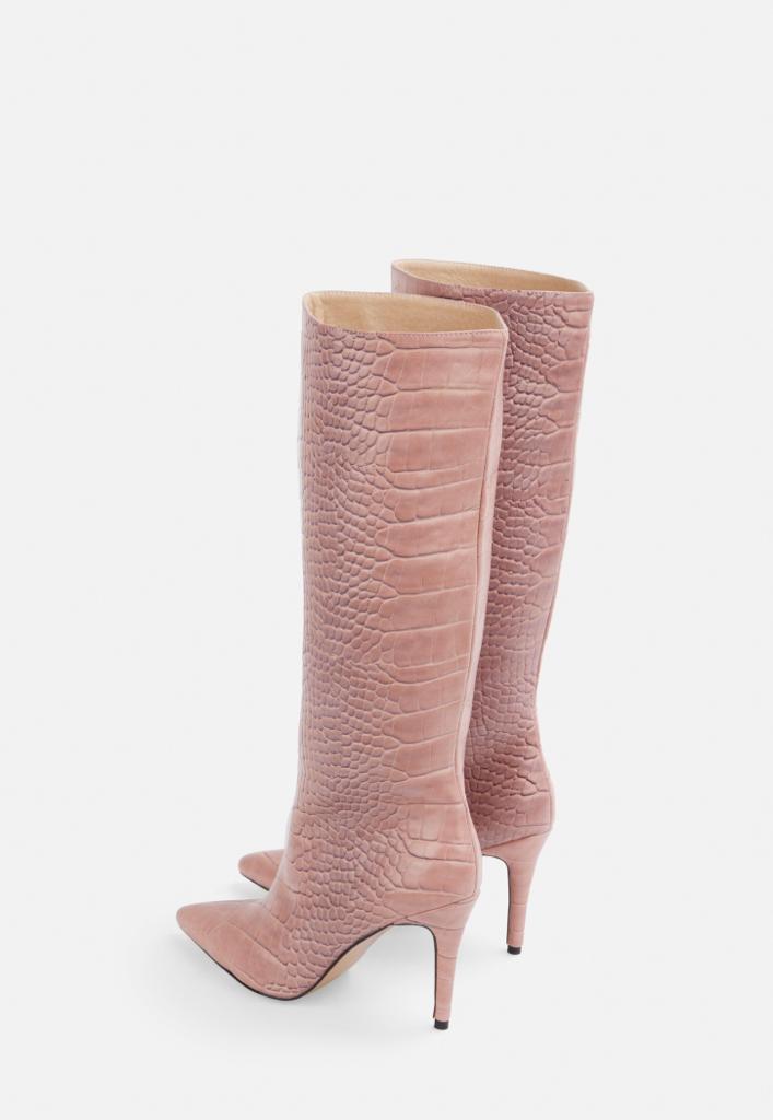 - جزمة بحدود الركبة بعكب متوسط واللون الوردي المتوسّط من العلامة التجارية "مس جايدد" Missguided Pink Mock Croc Mid Heel Knee High Boots