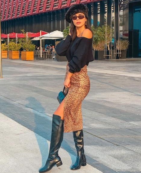 تألقت فرح عبد العزيز المؤثرة في عالم الموضة بتنورّة طويلة ومفتوحة بنمط جلد الفهد من "ريفولف" Revolve، وأقرنتها مع قميص أسود مكشوف الكتف بأكمام طويلة منفوخة من "لاكاديمي" L'Academie، وجزمة بحدود الركبة من الجلد الأسود.