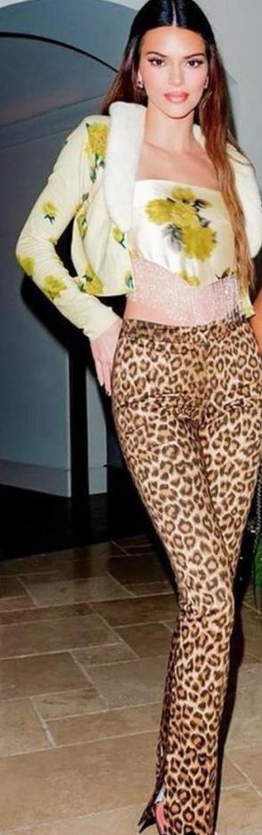 بدت كيندال مميّزة رغم بساطة الإطلالة باختيارها بنطلون مطاط يحاكي شكل الجسم "لغينغز" بنمط جلد الفهد أقرنته مع توب وسترة قصيرة مفتوحة مطبّعين بالورود الصفراء من مجموعة "بلو مارين" Blumarine لموسميّ ربيع وصيف 2021 ، وحذاء مفتوح مزيّن بحبّات البلوّر اختارته من مصمّمة الأحذية العربية "أمينة المعادي" Amina Muaddi Julia Crystal Embellished PVC Sandals.
