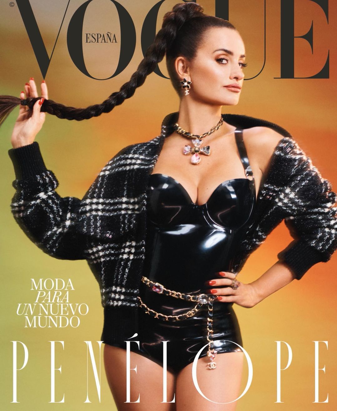 غلاف مذهل! بالسلاسل والبادي المصنوع من اللاتكس ... أحدثت Penelope Cruz ضجّة كبيرة على غلاف Vogue Spain المكرّس لشهر أيلول. سرّحت والدة لونا إنسيناس وليوناردو إنسيناس كروز بارديم، شعرها على شكل جديلة بنيّة طويلة جداً أمسكتها برقّة بأصابعها المطليّة، ووقفت أمام خلفية برتقالية للمجلة. أيقونة الموضة، وملهمة شانيل البالغة من العمر 48 عاماً وضعت سترة تويد للعلامة التجارية التي تمثّلها على كتفيها العاريتين.