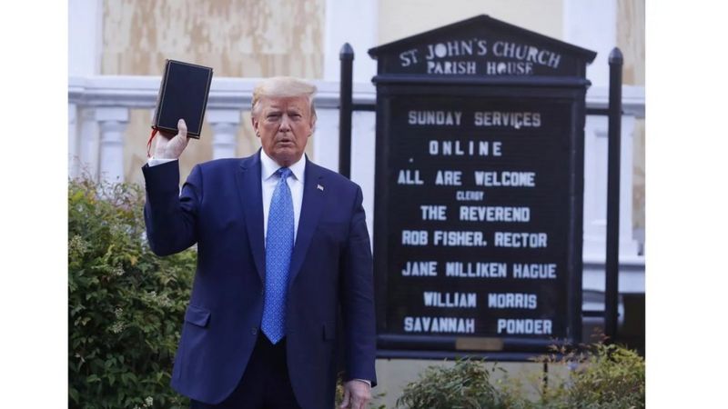 لا يوجد إلا القليل من الصور التي كانت أكثر قدرة على تلخيص أحداث العام الحالي ولا أكثر إثارة للجدل والانقسامات من صورة دونالد ترامب التي ظهر فيها رافعا الإنجيل أمام كنيسة سانت جون المغلقة بألواح الخشب قبالة البيت الأبيض في العاصمة واشنطن.