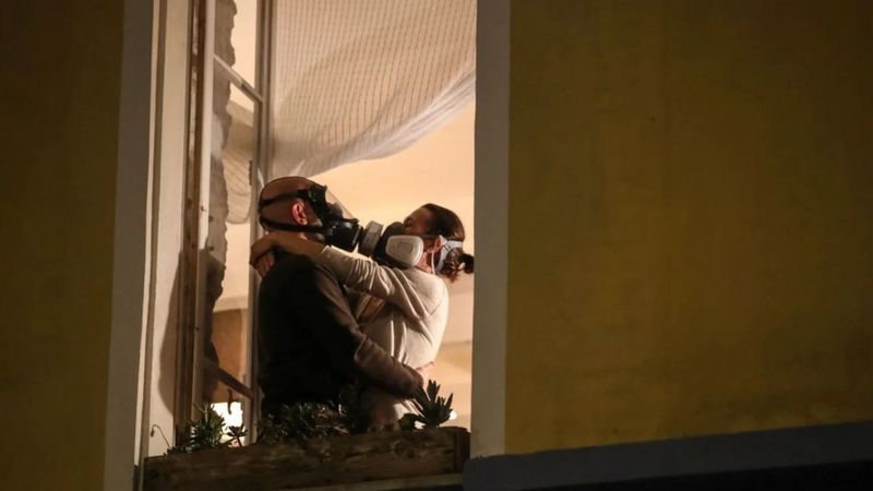 يجسد هذا العناق بين الزوجين الذين يرتديان قناعي غاز ضخمين، أمام نافذة في غرفة مضاءة بالمصباح في مدينة نيس في منطقة الريفييرا الفرنسية في الأسابيع الأولى للحجر الصحي في آذار (مارس) 2020، الإصرار الجماعي في العالم على مواصلة الحياة.