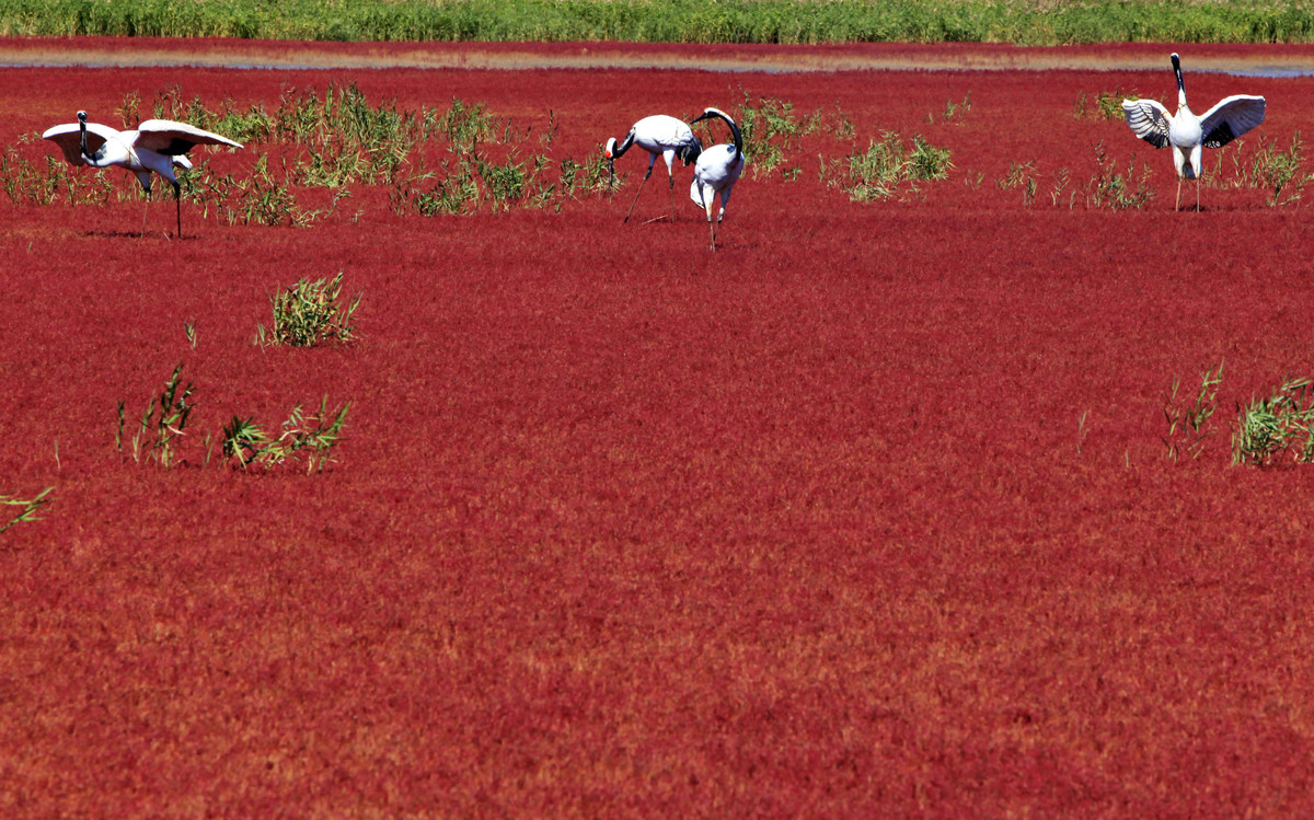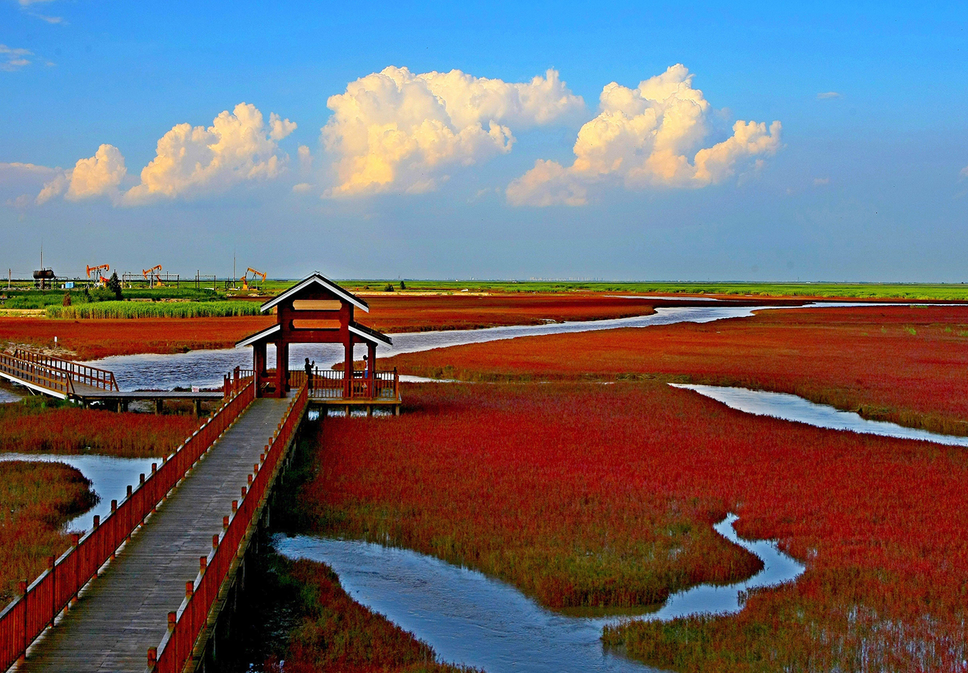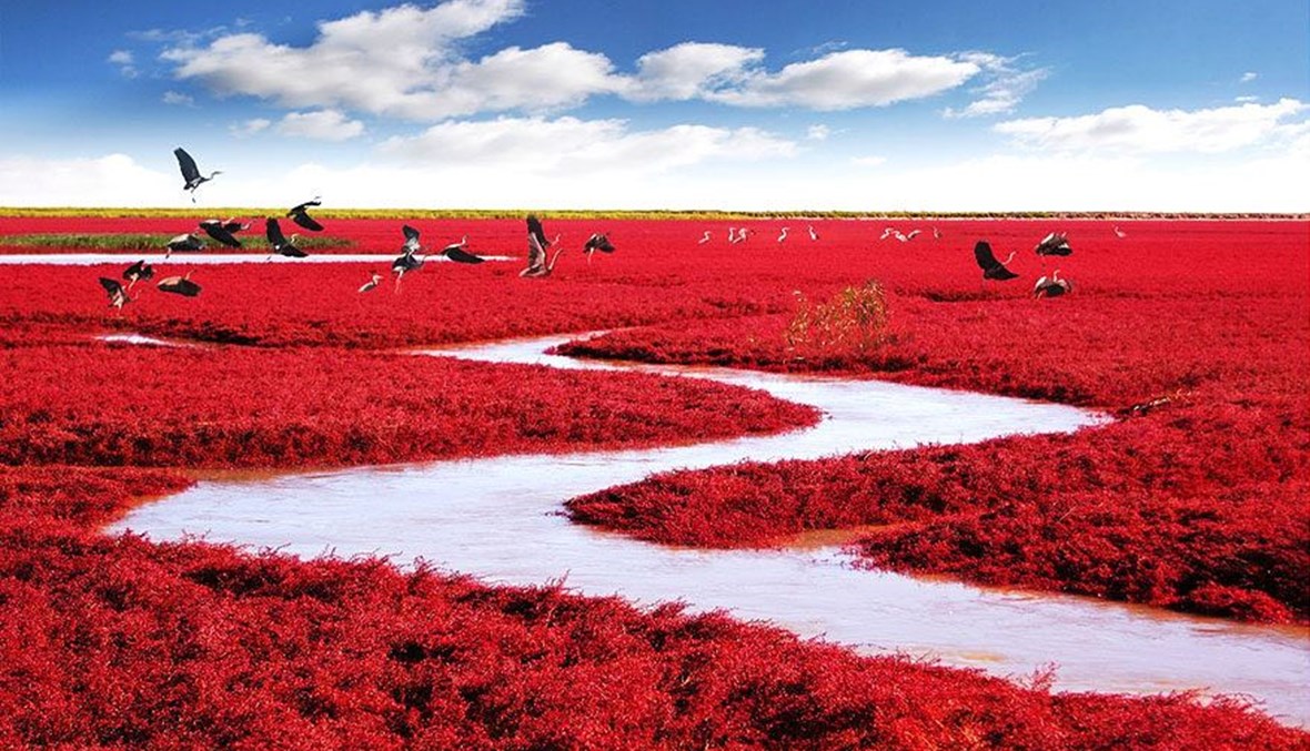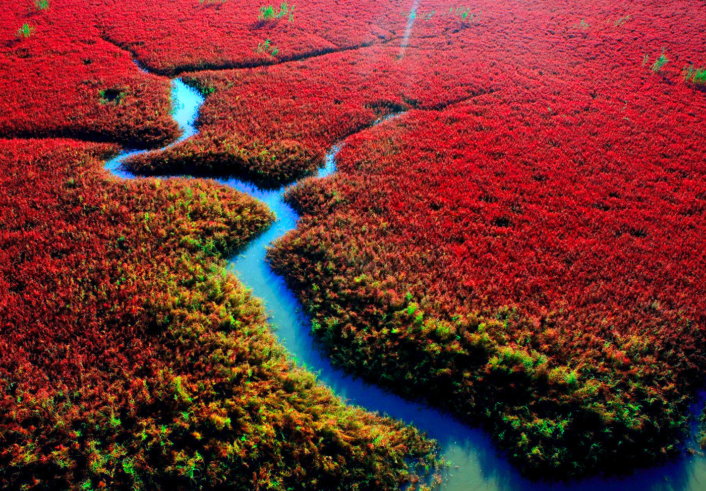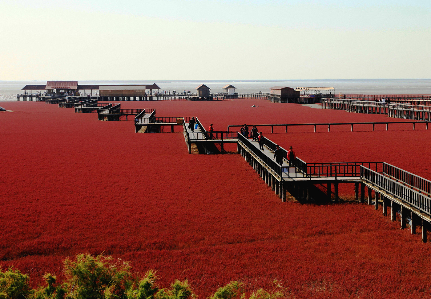 يقع شاطئ بانجين في واحدة من أكبر الأراضي الرطبة في العالم، وهو يتحوّل بطريقة مذهلة إلى اللون الأحمر الجميل في كل خريف.