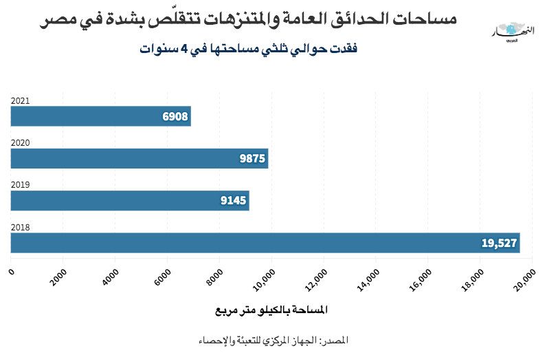 بحسب إحصائية للجهاز المركزي للتعبئة والإحصاء (2020)، وصلت مساحة المتنزهات والحدائق العامة في مصر، بما فيها حدائق الحيوان والأسماك إلى حوالي 17 ألف كيلومتر مربع، وبذلك يصبح متوسط نصيب الفرد من المساحات الخضراء 17 سنتيمتراً، في المقابل تقول الهيئة العامة للاستعلامات في مصر إن نصيب الفرد من المساحات الخضراء يقدر بنحو 1.2 متر مربع.