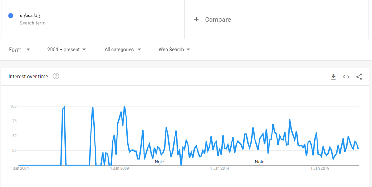 وتشير بيانات "غوغل تريندز" خلال الفترة بين عامي 2004-2020 إلى أن عمليات البحث عن كلمات متعلقة بـ"زنا المحارم" شهدت ارتفاعاً ملحوظاً، فيما لم تكن هناك عمليات بحث تذكر تقريباً قبل عام 2004.