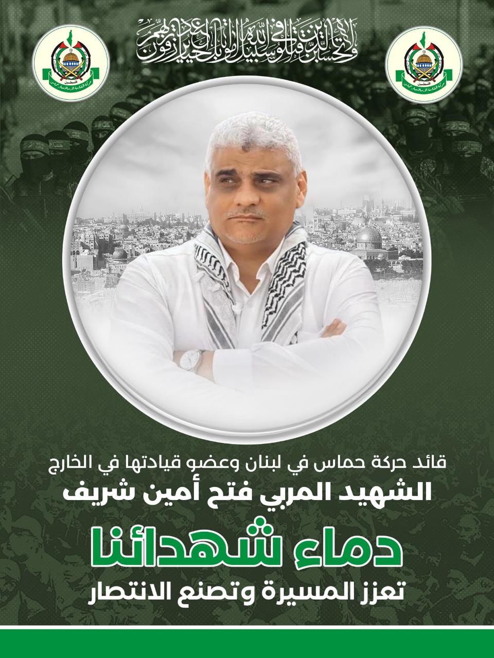 أعلنت حركة المقاومة الإسلامية الفلسطينية (حماس) اليوم الإثنين أن قائدها في لبنان وعضو قيادتها في الخارج فتح شريف أبو الأمين قُتل مع بعض أفراد عائلته في ضربة إسرائيلية في جنوب لبنان.