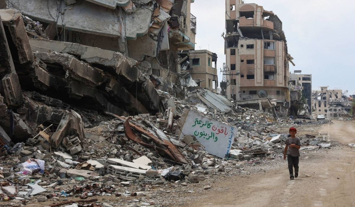 طفل فلسطيني يسير أمام أنقاض المباني في مدينة غزة (أ ف ب)