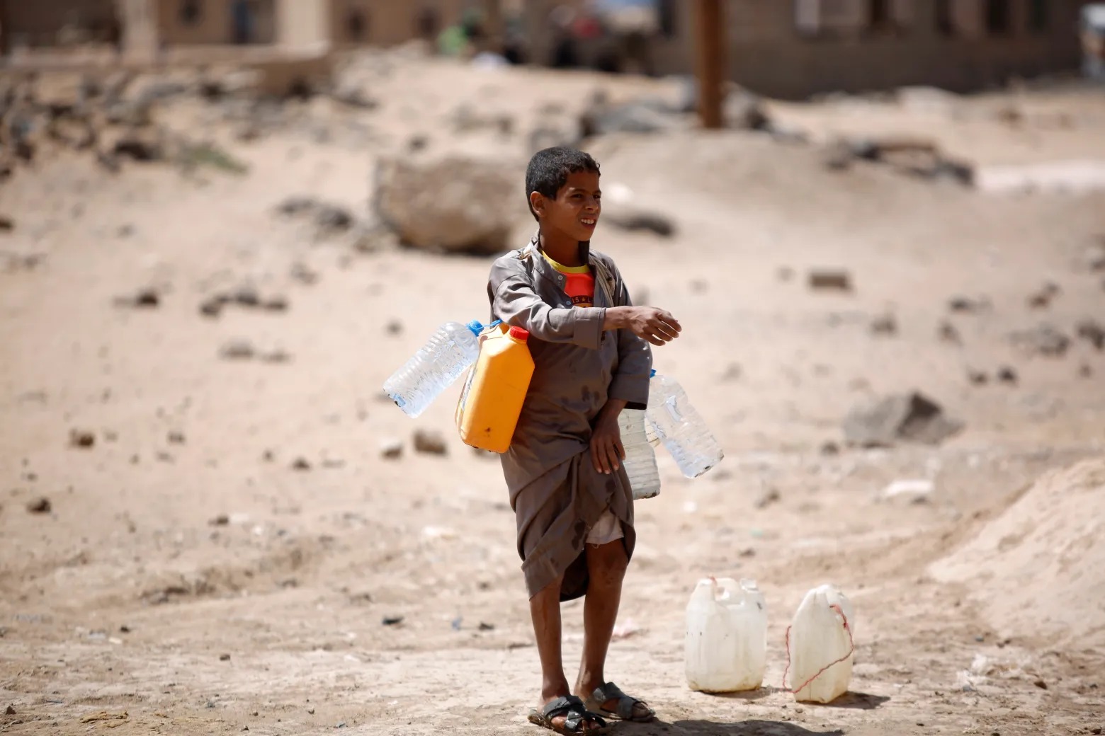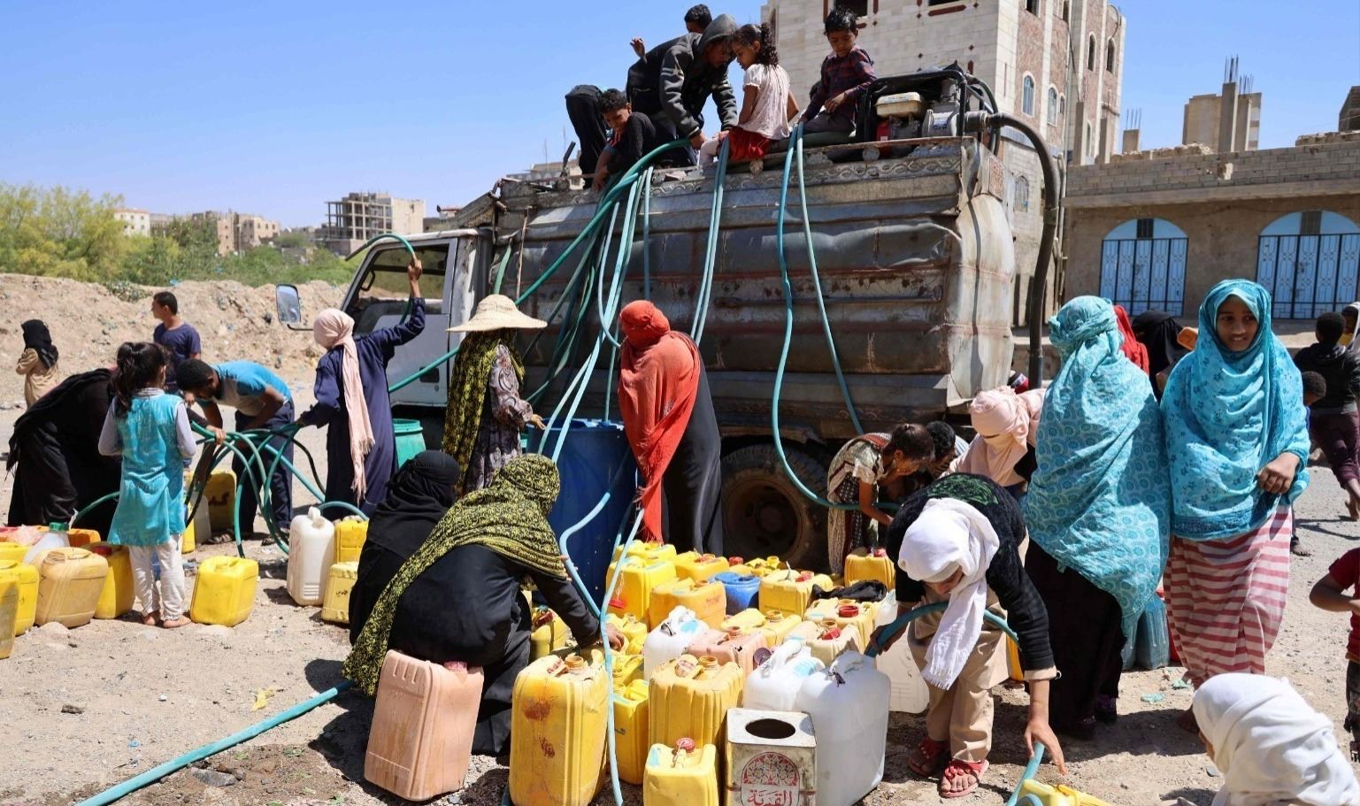 يمنيّون يحصلون عل المياه من شاحنة.