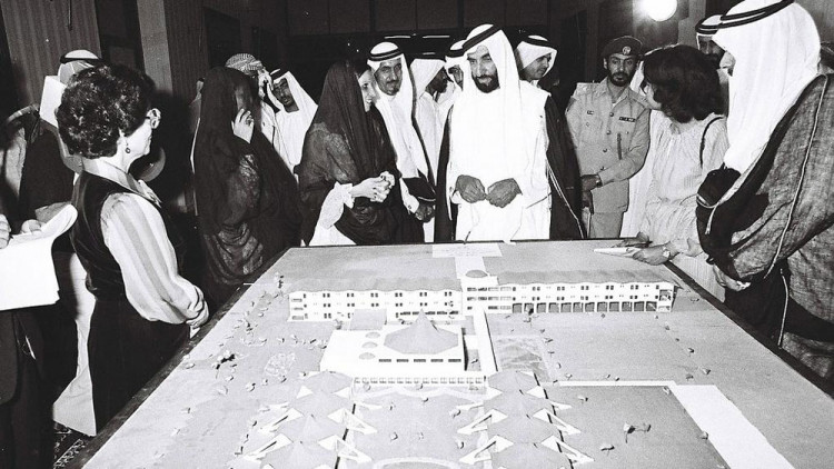 الشيخ زايد بن سلطان آل نهيان يطلع على نموذج لمبنى الاتحاد النسائي العام في أبوظبي عام 1978.