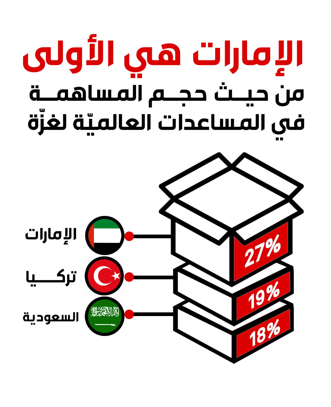هذه الجهود وغيرها مكّنت الإمارات من احتلال المركز الأوّل عالميّاً في حجم المساعدات المقدّمة إلى غزّة عبر مختلف القنوات المتاحة. فبحسب أرقام خدمة "مصدر" الإخباريّة أواخر الشهر الماضي، ساهمت الإمارات العربيّة المتّحدة في أكثر من ربع (27 في المئة) المساعدات الدوليّة المقدّمة إلى الفلسطينيّين في غزة.